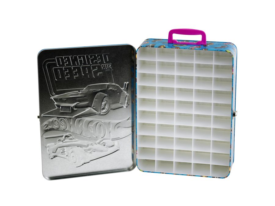 Metalowa puszka w eleganckim wzornictwie na licencji serii Hot Wheels jest nie tylko solidna, lecz także praktyczna. Posiada przemyślane przegródki na 50 pojazdów Hot Wheels. Puszka zapewnia bezpieczne przechowywanie samochodzików, a dzięki praktycznemu uchwytowi można zabrać ją ze sobą dosłownie wszędzie. Nie wszystkie dzieci lubią kiedy prosi się je o posprzątanie, ale ta puszka z pewnością ułatwi dzieciom pozbieranie i sprzątanie ulubionych samochodzików. Cała walizeczka wykonana jest z metalu i jest zadrukowana ciekawym chłopięcym wzorem serii Hot Wheels oraz logo marki. Na górze puszki znajduje się wygodna, pomarańczowa rączka, a przed niekontrolowanym otwarciem się puszki zabezpiecza metalowe zamknięcie – klips. W środku znajduje się wkładka z przegródkami na samochodziki, wykonana z tworzywa sztucznego wysokiej jakości. Wszystkie przegródki mają jednakowy wymiar i mieszczą się w nich autka/resoraki standardowej wielkości. Wszystkie auta zaparkowane są w taki sposób, że po otwarciu walizeczki każde z nich jest widoczne od przodu lub tyłu w zależności od tego jak je zaparkujemy, ale za to bardzo szybko można wyjąć konkretny model. W zestawie nie ma samochodzików.