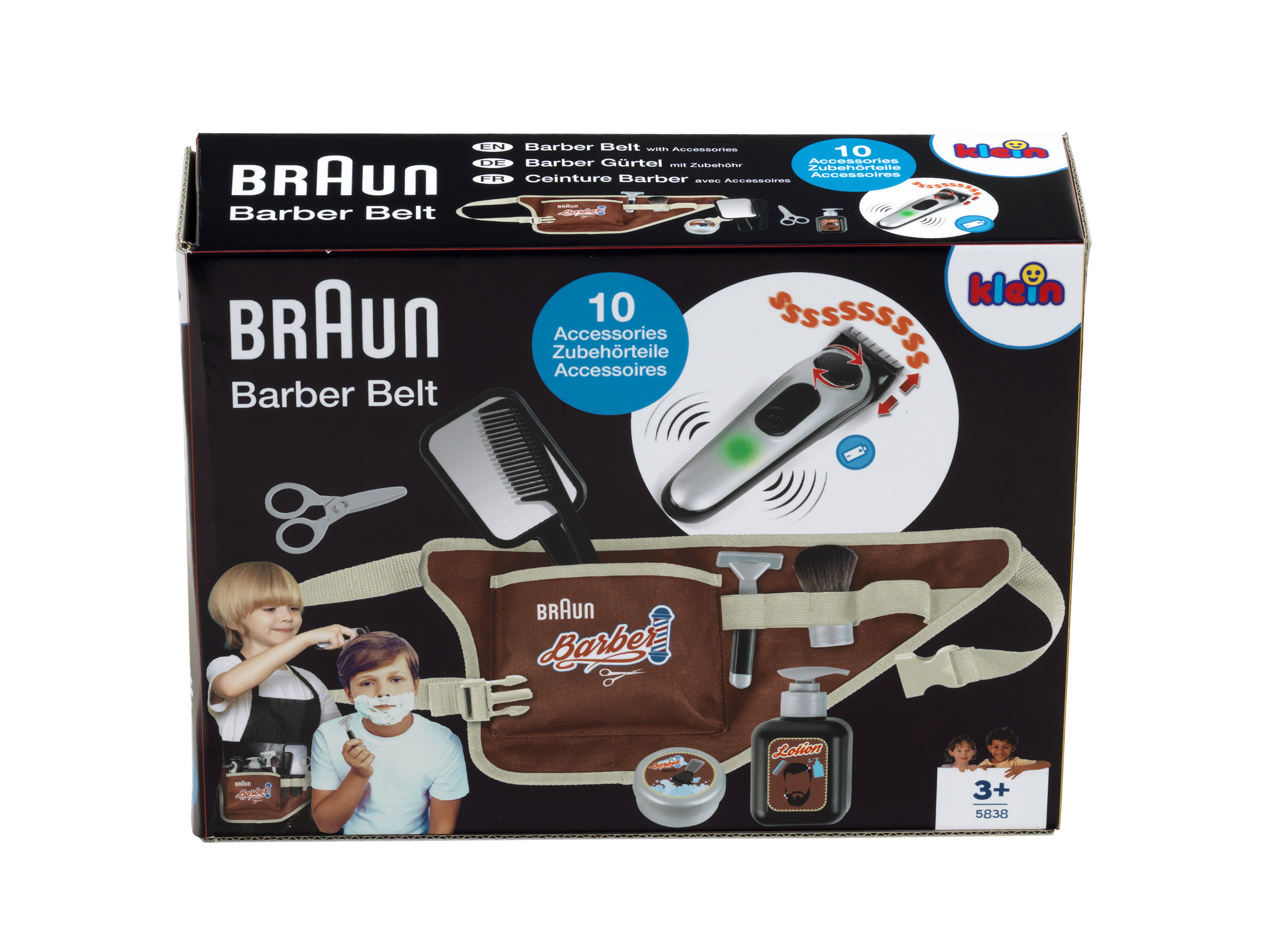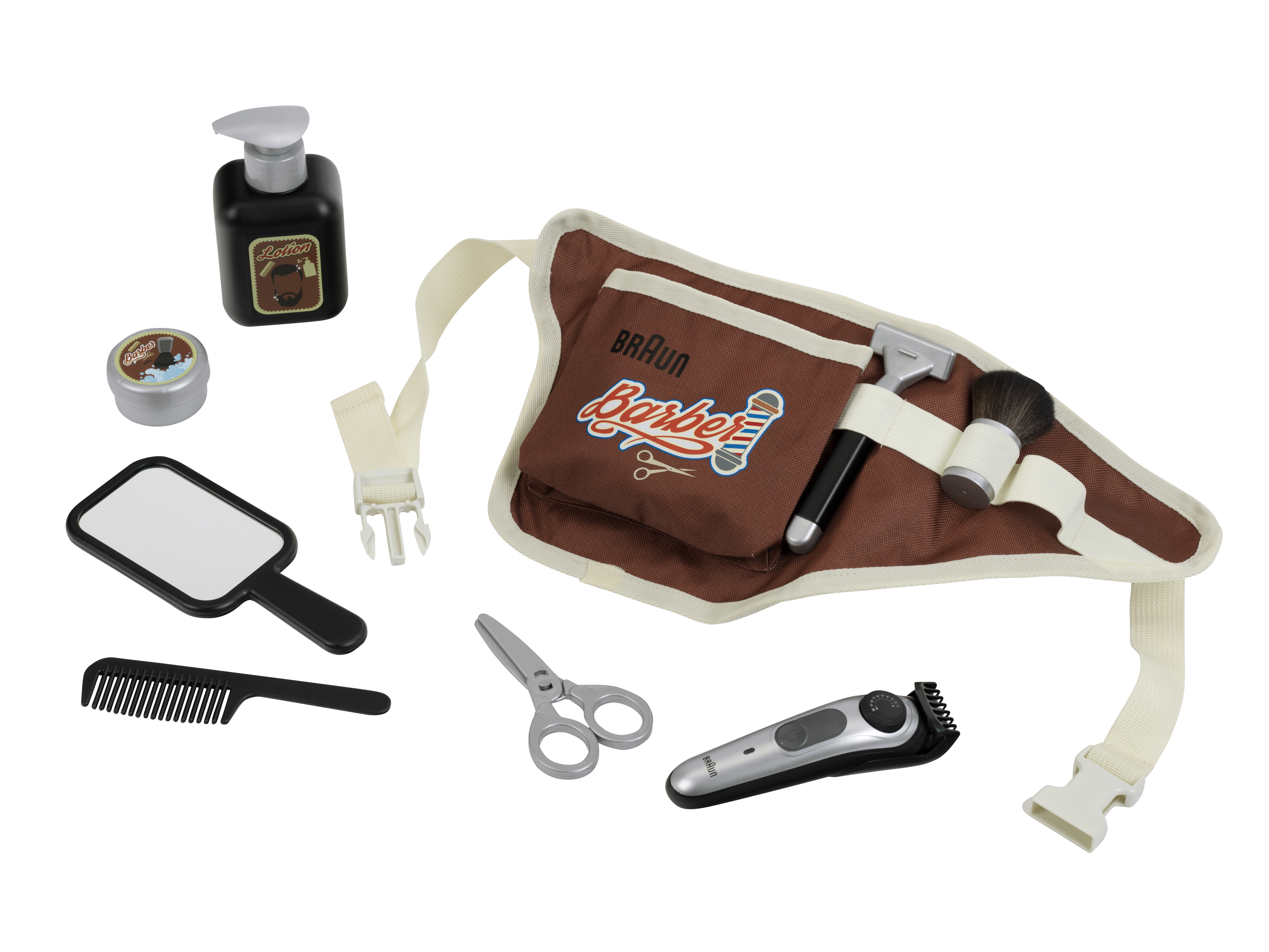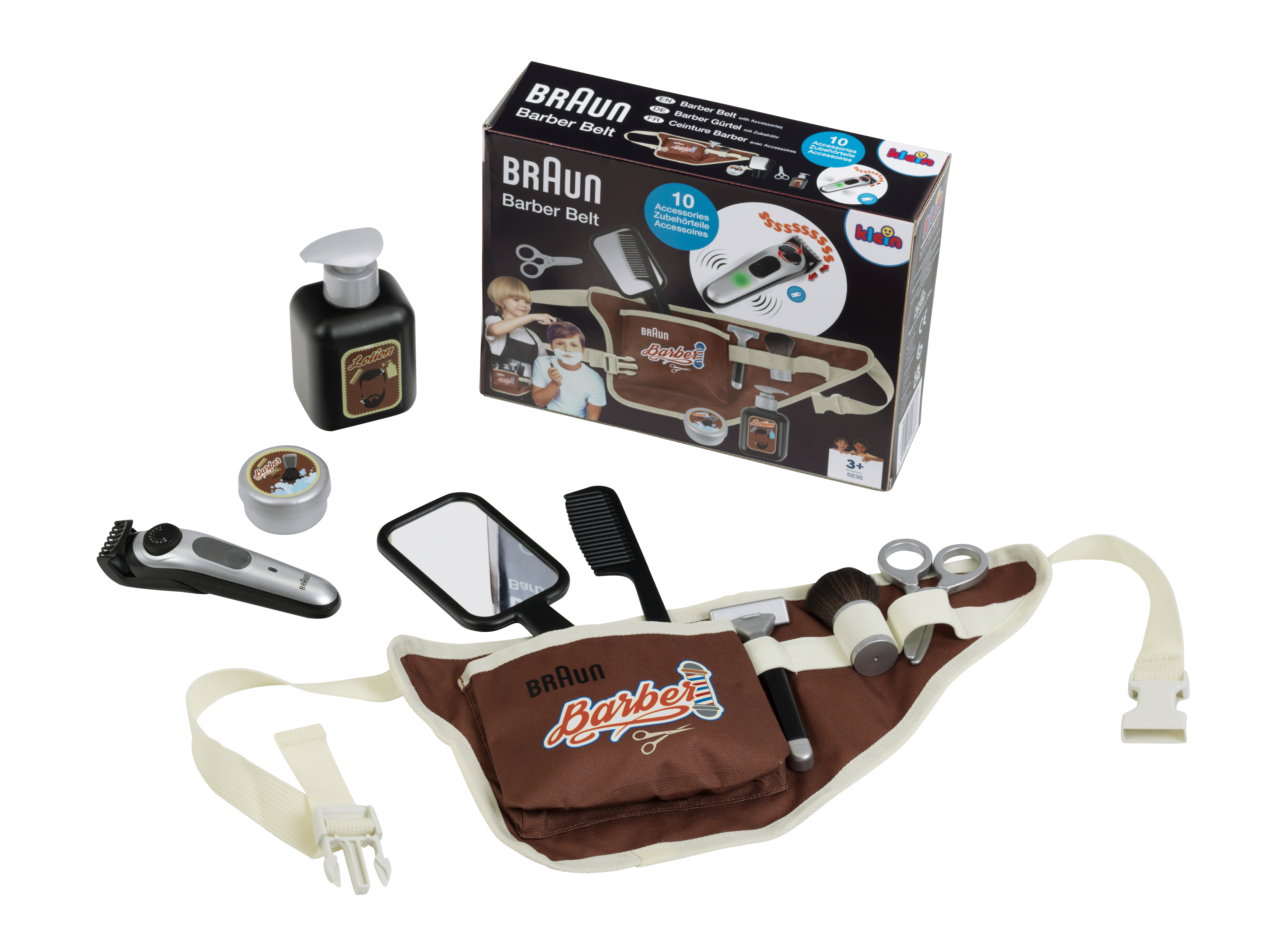 Ten zestaw fryzjerski zawiera zasilaną bateryjnie maszynkę do brody, która jest wierną reprodukcją oryginalnego projektu Braun, ale oczywiście działa w sposób przyjazny dla dzieci i nie nagrzewa się ani nie tnie. Pasuje do torby do przechowywania, która zawiera wiele akcesoriów: grzebień, lusterko, nożyczki, szczotkę, zabawkową maszynkę do golenia na mokro, małą puszkę i dozownik mydła.