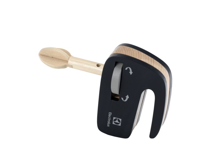 Nowoczesny drewniany mikser ręczny ma wszystko, czego potrzebują dzieci, które kochają kuchnię i gotowanie. Zabawka powstała na licencji Electrolux. Mikser został wykonany z drewna, gdzie korpus urządzenia jest w kolorze czarnym, natomiast grzbiet oraz trzepaczka są w kolorze naturalnego drewna. Zabawka posiada szare drewniane pokrętło, które obraca trzepaczką, imitując pracę prawdziwego urządzenia. Wygląda nowocześnie, a wierna oryginałowi zabawka ma zaokrągloną rączkę, która idealnie dopasowuje się do dziecięcych rączek. Urządzenie jest solidnie wykonane, więc jest w stanie przetrwać wiele lat, dziecięcych zabaw w kuchnię.