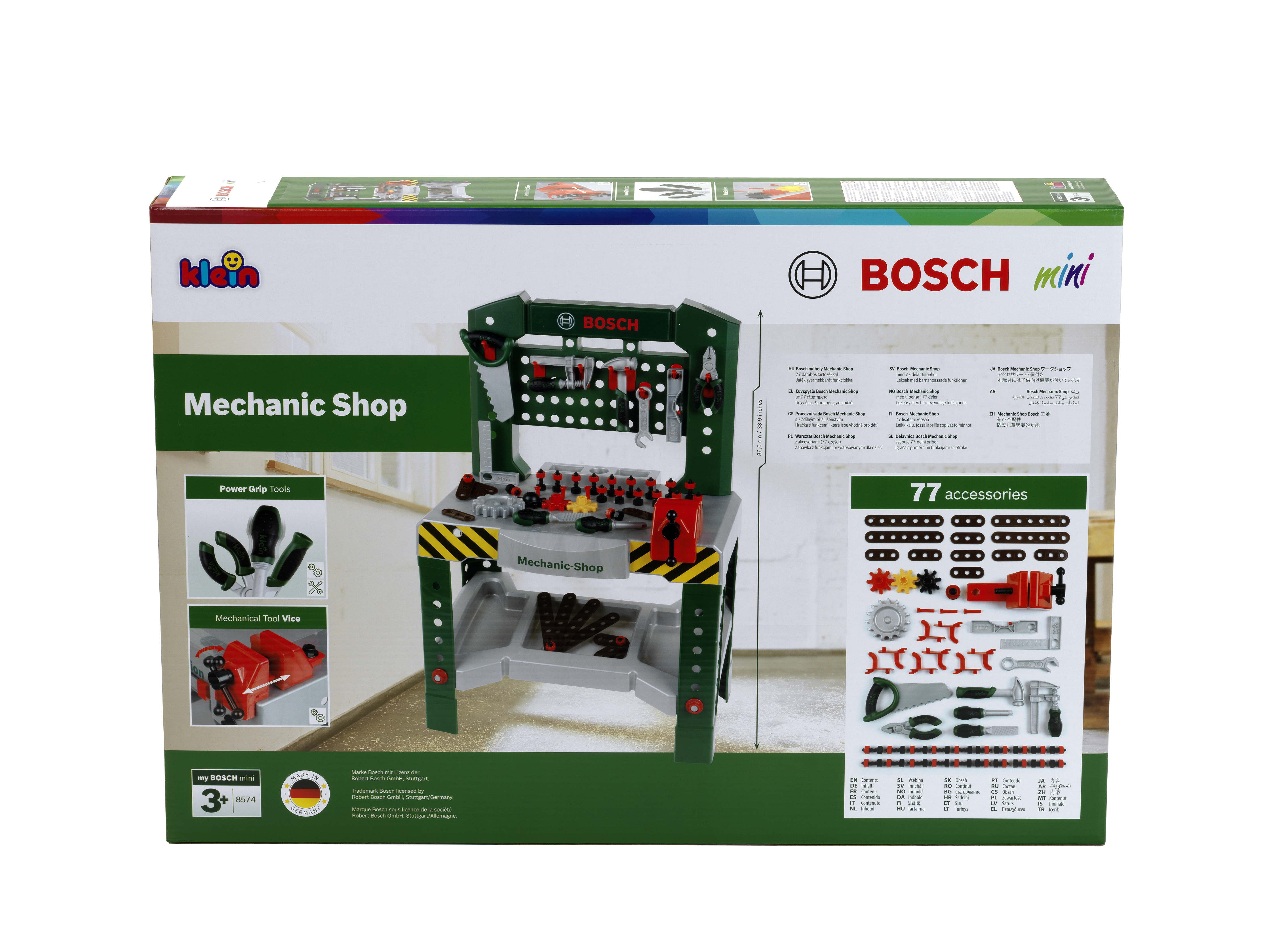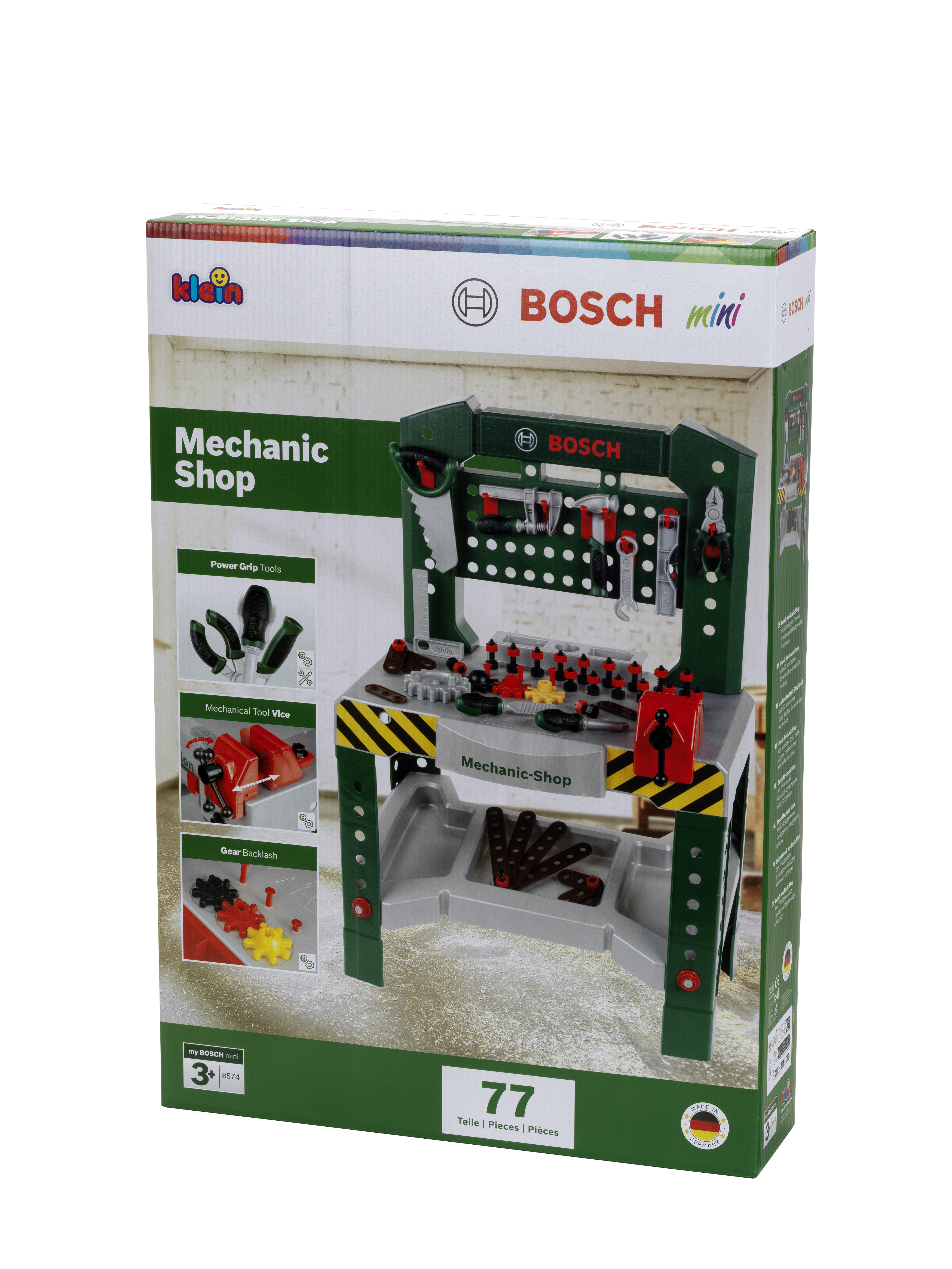 Warsztat marki Klein pochodzi z serii zabawek Bosch mini powstałej na licencji firmy Bosch, dlatego też narzędzia wchodzące w jego skład są wiernymi kopiami faktycznie istniejących narzędzi tej marki. W zestawie zapakowanym w duży zielony karton Klein, znajdziemy 77 elementów konstrukcyjnych i narzędzi do zabawy. Głównym elementem tego zestawu jest z pewnością szaro-zielony stół warsztatowy ze ścianą z czerwonymi haczykami. Narzędzia będące częścią tego warsztatu to czerwone imadło, młotek, kombinerki, piła, pilnik, śrubokręt i ścisk stolarski. Zabawki te mają ciemno-zielone rączki, a ich wygodny uchwyt ma dodatkowo czarną profilowaną powierzchnię z logo Klein ułatwiającą utrzymanie narzędzia w dziecięcych dłoniach. Dodatkowo przy warsztacie znajdziemy jeszcze srebrny klucz płaski, poziomicę i kątownik, a także wiele innych drobnych elementów, jak śrubki, nakrętki, czy inne części konstrukcyjne do kreatywnej zabawy. Wszystkie elementy zestawu są wykonane z plastiku, pozbawione ostrych krawędzi i całkowicie bezpieczne dla dziecka. Zestaw został stworzony z dbałością o szczegóły i detale z wysokiej jakość materiałów, przez co wiernie naśladuje prawdziwe narzędzia i będzie służyć dzieciom przez długi czas. Dzięki warsztatowi dzieci w bezpieczny sposób będą mogły wcielić się w rolę majsterkowicza, zapewniając sobie realistyczne doświadczenie korzystania z wszystkich jego narzędzi. Dzieci uwielbiają naśladować rodziców wykonujących codzienne czynności domowe lub w nich uczestniczyć, jednak nie zawsze jest to możliwe ze względów bezpieczeństwa, a dzięki temu całkowicie bezpiecznemu dla dzieci, zabawkowemu warsztatowi z narzędziami każdy mały majsterkowicz może bezpiecznie robić to, co jego opiekunowie.