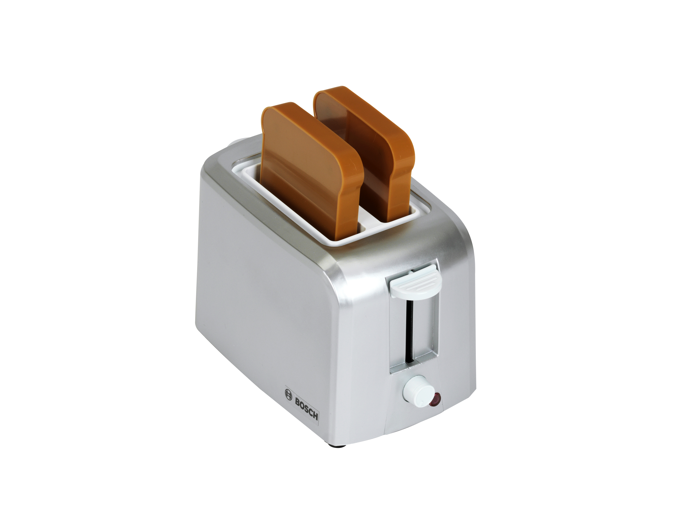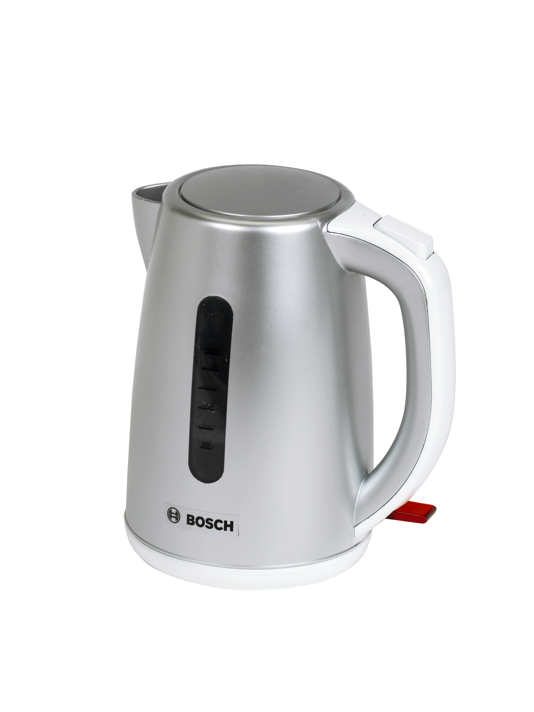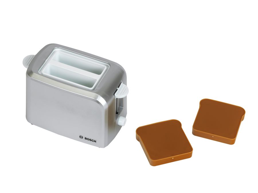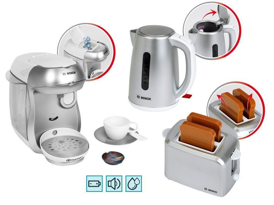 Zestaw Klein powstał na licencji Bosch, dlatego też są wierną kopią prawdziwych urządzeń produkowanych przez tę firmę. Firma Klein od lat produkuje odpowiedniki prawdziwych narzędzi i akcesoriów AGD, przeznaczone do zabawy dla najmłodszych. Zestaw składa się z ekspresu do kawy, czajnika , tostera oraz naczyń i sztućców. Cały zestaw AGD znajdujący się w zestawie jest w kolorze srebrnym, dzięki czemu całość stanowi doskonałą imitację prawdziwych produktów firmy Bosch. Ekspres jak prawdziwy, posiada ociekacz, który można ustawić na dwóch wysokościach w zależności od rodzaju postawionej szklanki i zaparzanej kawy. Ekspres został także wyposażony w efekt dźwiękowy, który sprawia zabawę jeszcze bardziej realistyczną. Do właściwego funkcjonowania zabawki wymagane są baterie, które nie są częścią zestawu. Ponadto ekspres posiada otwieraną górną klapkę, gdzie umieszcza się zabawkowe kapsułki z kawą, a dodatkowo zabawka ma także prawdziwy przepływ wody. Czajnik posiada podnoszoną za pomocą naciśnięcia przycisku pokrywkę i także w ramach dobrej realistycznej zabawy można go uzupełnić wodą. Toster także jest bezpieczny do zabawy dla dzieci, gdyż nie nagrzewa się, a tosty automatycznie wyskakują po kilku sekundach, sygnalizując zakończenie imitacji procesu podgrzania dźwiękiem dzwonka. Zabawka nie wymaga użycia baterii. Ponadto w tym dużym zestawie śniadaniowym znajdują się filiżanka, spodek do filiżanki a także mała łyżeczka, 2 sztuczne tosty i kapsułka do ekspresu. Wszystkie materiały, które zostały użyte do stworzenia dużego zestawu śniadaniowego są najwyższej jakości, a także bezpieczne dla dziecka. Cały zestaw pozwoli każdemu dziecku na naśladowanie rodziców w sposób bezpieczny i pełen dobrej zabawy. Wielkość wszystkich elementów i akcesoriów zestawu jest dopasowana do potrzeb i rączek dziecka. Zabawka z pewnością będzie również świetnym uzupełnieniem pozostałych zestawów kuchennych firmy Klein.
