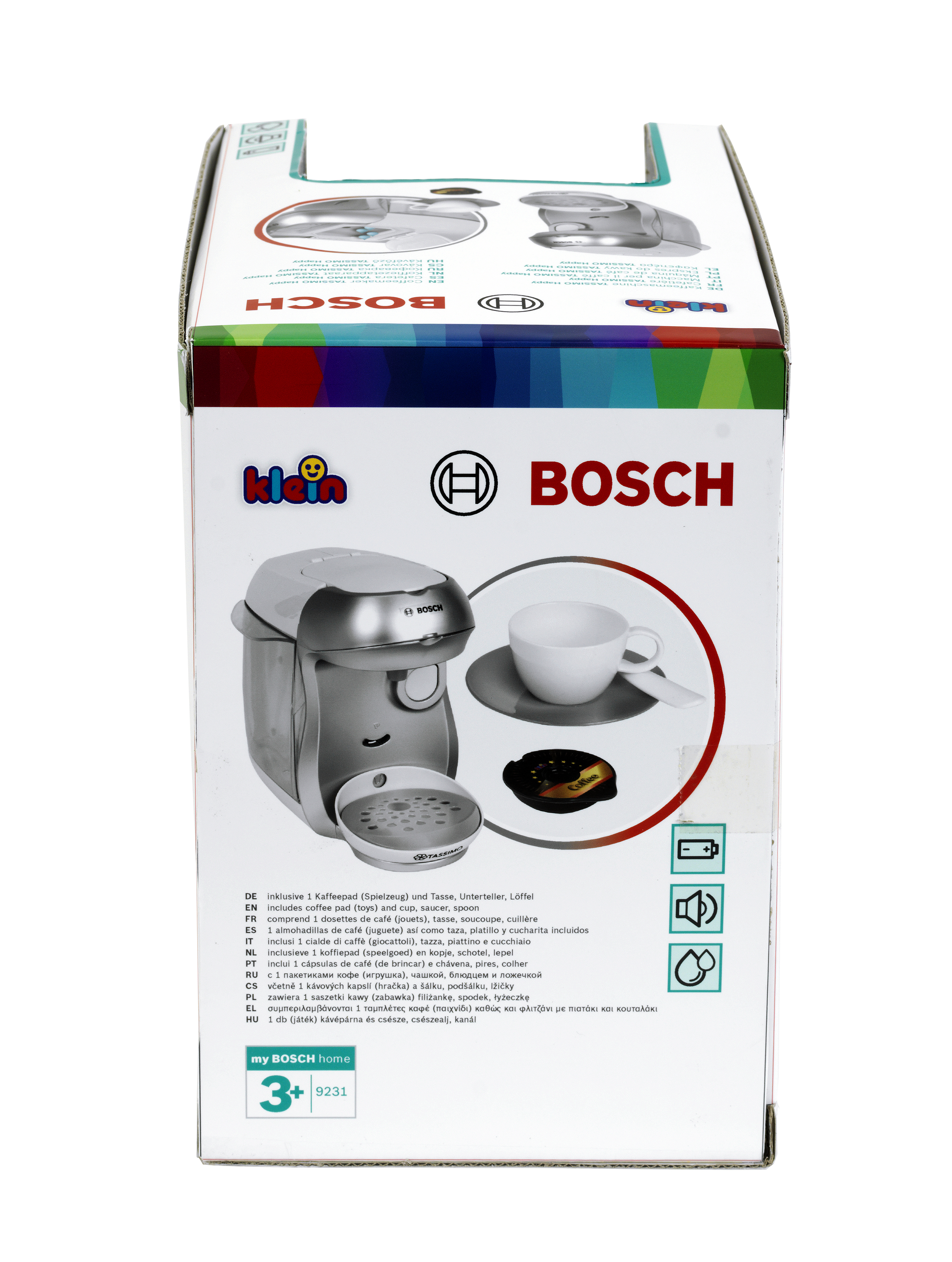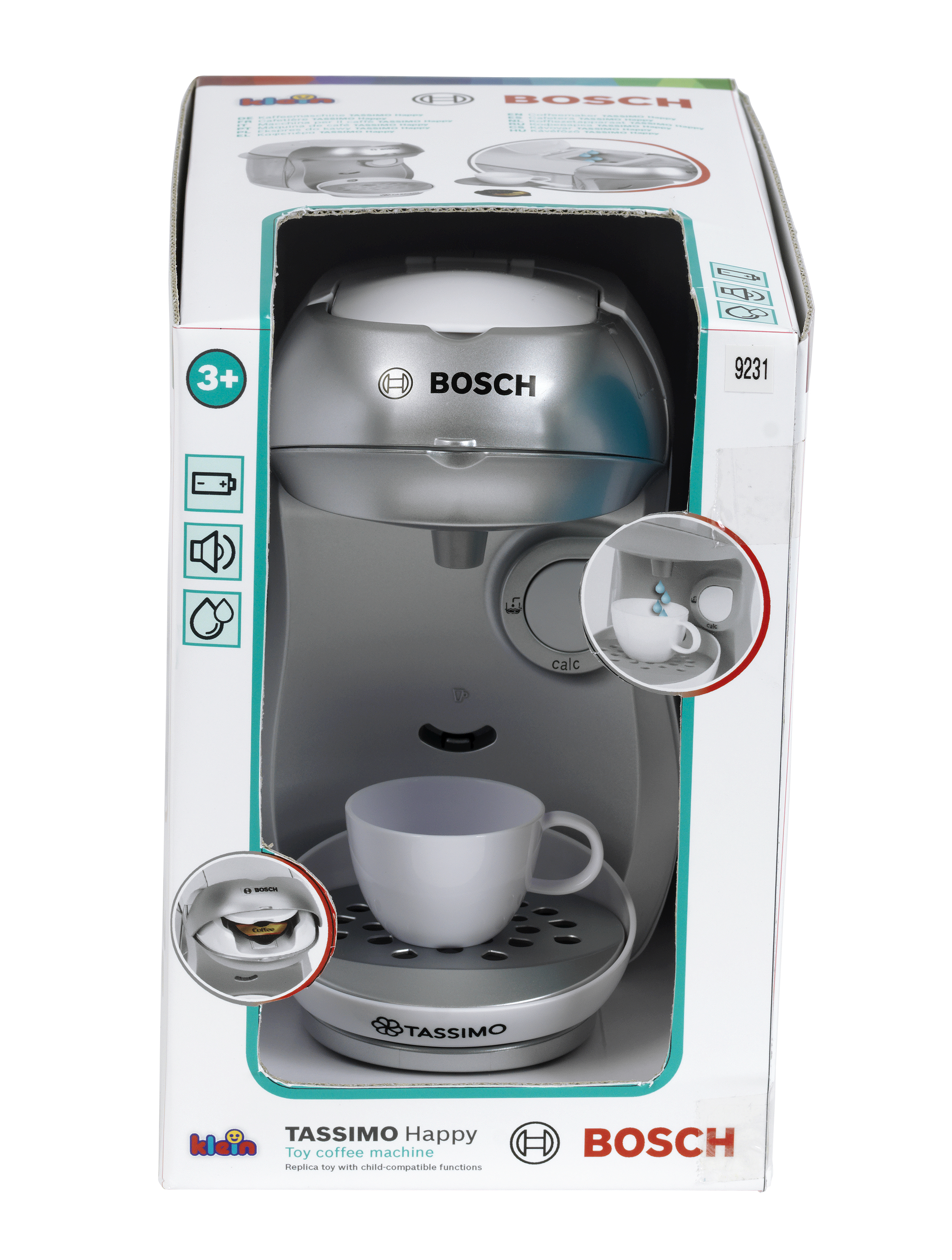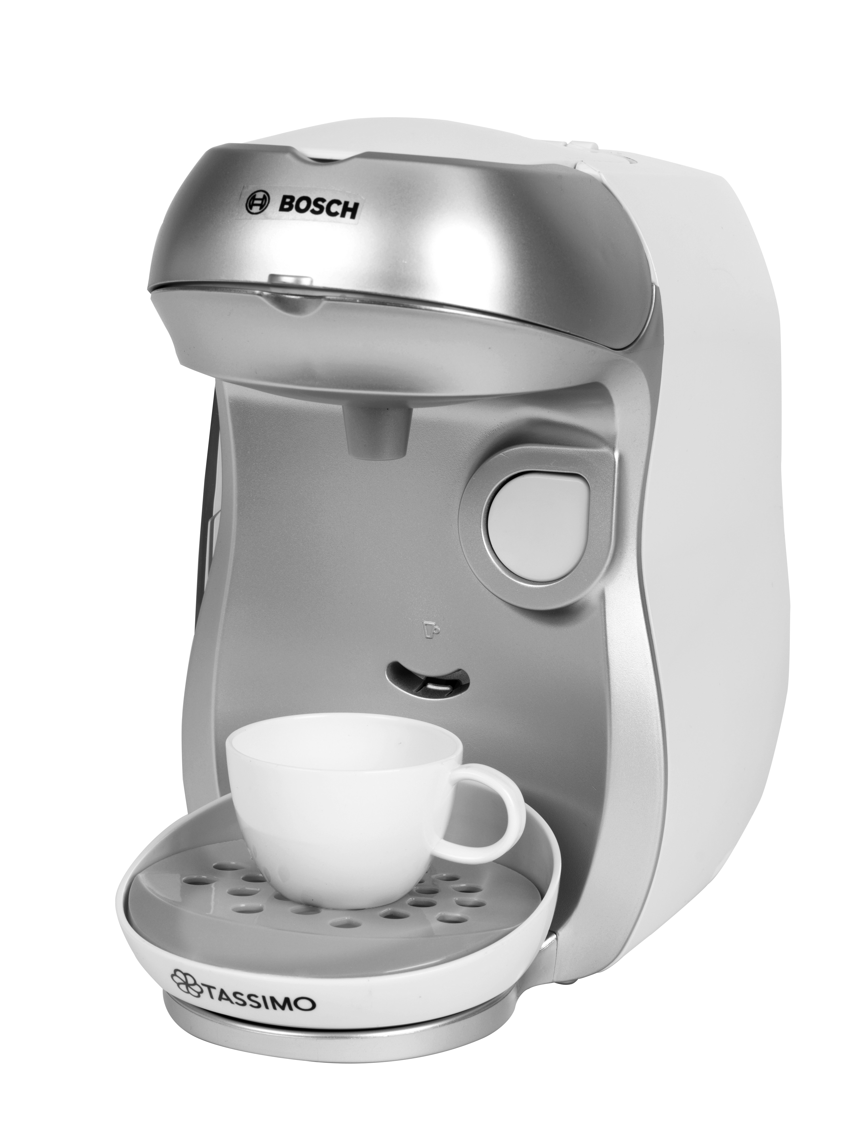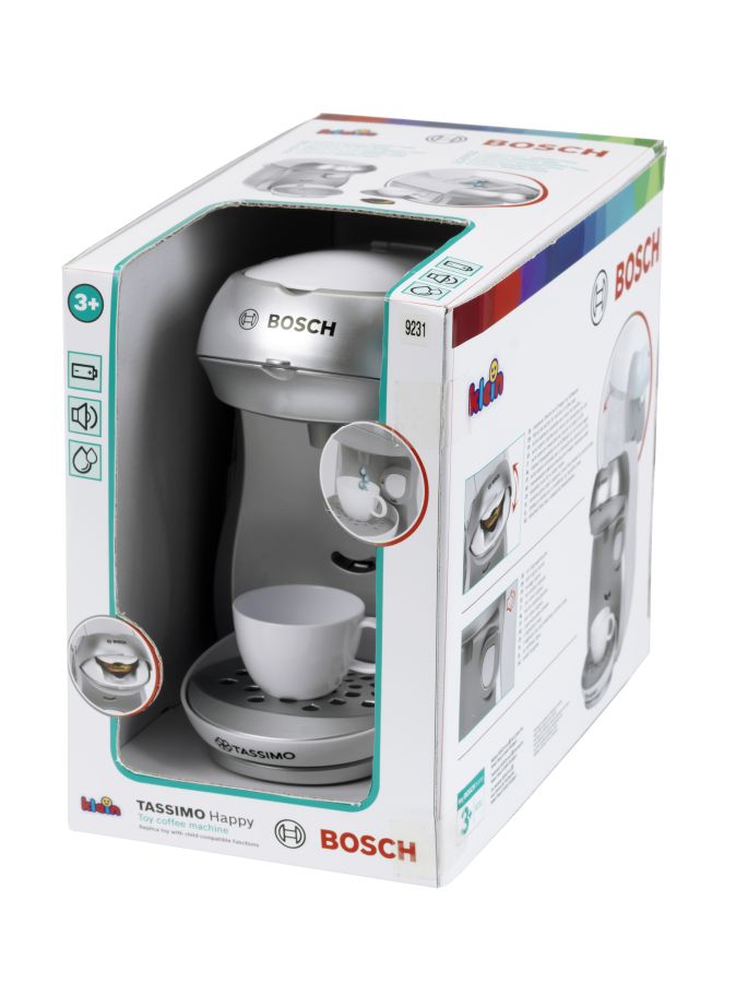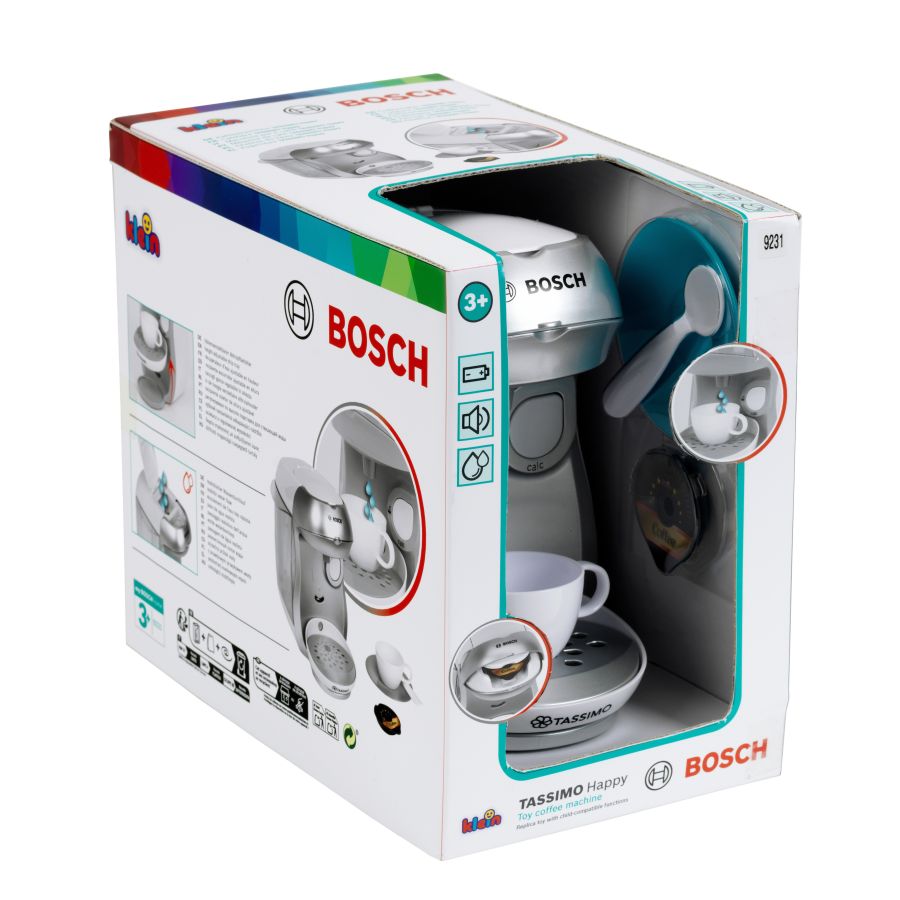 Ekspres do kawy Tassimo Klein powstał na licencji Bosch, dlatego też są wierną kopią prawdziwego urządzenia produkowanego przez tę firmę. Firma Klein od lat produkuje odpowiedniki prawdziwych narzędzi i akcesoriów AGD, przeznaczone do zabawy dla najmłodszych. Ekspres do kawy jest w kolorze srebrnym. Jak prawdziwy, posiada on ociekacz, który można ustawić na dwóch wysokościach w zależności od rodzaju postawionej szklanki i zaparzanej kawy. Ekspres został także wyposażony w efekt dźwiękowy, który sprawia zabawę jeszcze bardziej realistyczną. Do właściwego funkcjonowania zabawki wymagane są baterie, które nie są częścią zestawu. Ponadto ekspres posiada otwieraną górną klapkę, gdzie umieszcza się zabawkowe kapsułki z kawą, a dodatkowo zabawka ma także prawdziwy przepływ wody. Wodę wystarczy wlać do zbiorniczka znajdującego się na górnym panelu ekspresu, a następnie nacisnąć duży przycisk start stop, aby móc cieszyć imitacją efektu parzenia kawy. W zestawie z ekspresem znajduje się jedna filiżaneczka ze spodkiem, szara łyżeczka i dwie zabawkowe kapsułki z kawą - Espresso i Coffee. Ten zabawkowy ekspres do kawy Tassimo Bosch pozwoli każdemu dziecku na naśladowanie rodziców w sposób bezpieczny i pełen dobrej zabawy. Wielkość ekspresu jest dopasowana do potrzeb i rączek dziecka. Zabawka z pewnością będzie również świetnym uzupełnieniem pozostałych zestawów kuchennych firmy Klein.